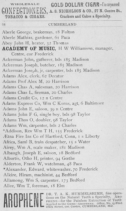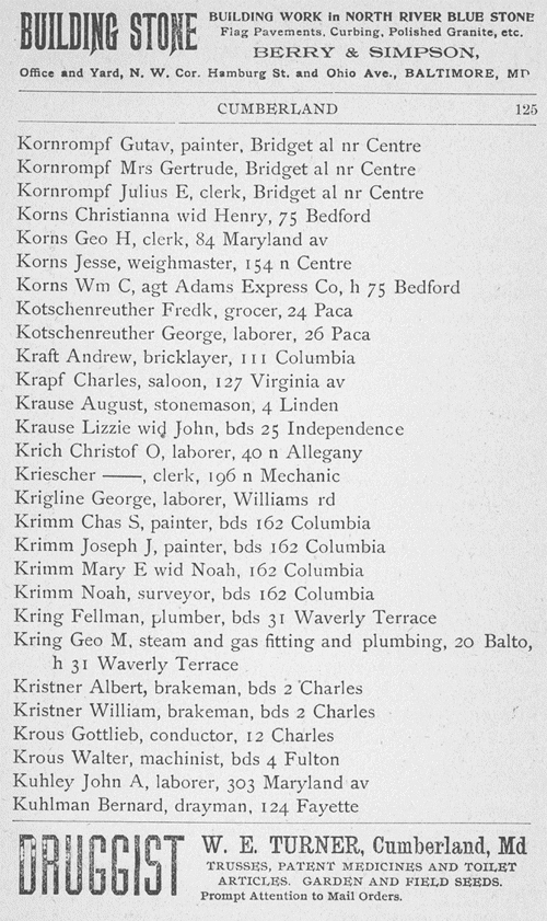 The 1900 census of Cumberland City, Allegany County, Maryland lists a George H. Korns, born in December 1855. His wife Fannie was born in May, 1861. The children listed in the census are a stepson Howard E. Chaney born June, 1882, a daughter Nellie S. born July 1884, a daughter Amelia born March, 1886, a son George born November, 1887, a stepson Walter L. Chaney, born April, 1888, a son Jessie born July, 1889, a daughter Lizzie born February 1890, a daughter Pearl S. born September 1890, and a daughter Lillie E. born September, 1895. Some of the births appear too close together, and seem difficult to believe. The dates may be mistaken, or may represent adoption.