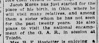 The following news items are about Jacob Korns of Tama County, Iowa, who was a son of Daniel Korns, Sr. of Southampton Township, Somerset County, Pennsylvania.