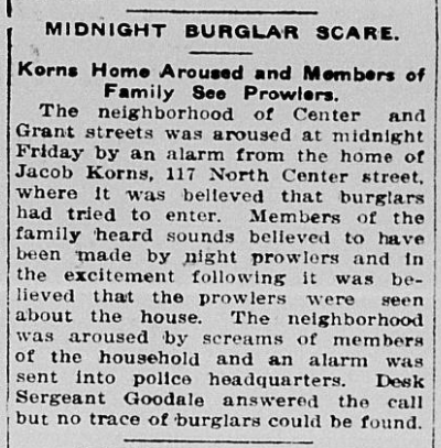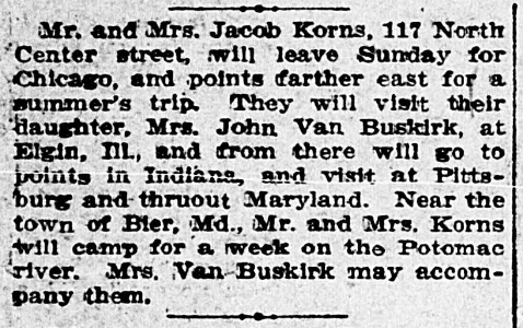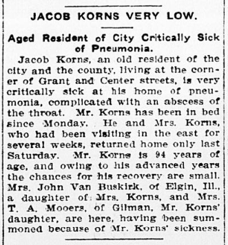 Until very recently Mr. Korns, accompanied by his wife and step-daughter, Mrs. John Van Buskirk, of Elin, Ill., had been on a visit to Mr. Korns' old home at Wellersburg, Somerset county, Pennsylvania, where he had visited many relatives, including two nieces and nephews, both in Pennsylvania and Maryland. Shortly after his return home Mr. Korns was stricken with pneumonia, and an abscess, that developed on the lungs caused his death at 11:55 Friday night.