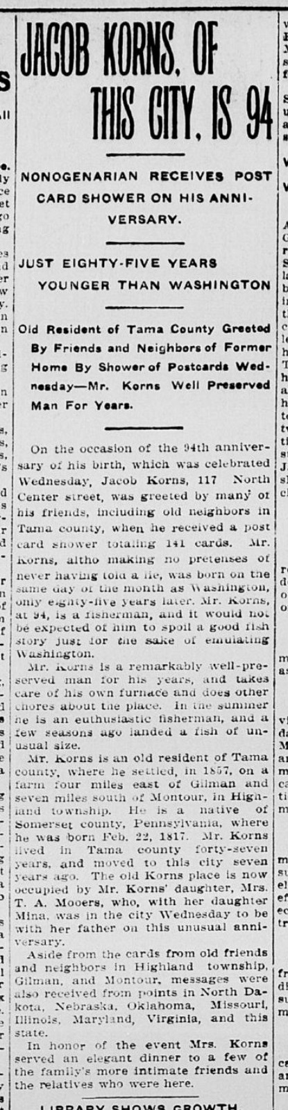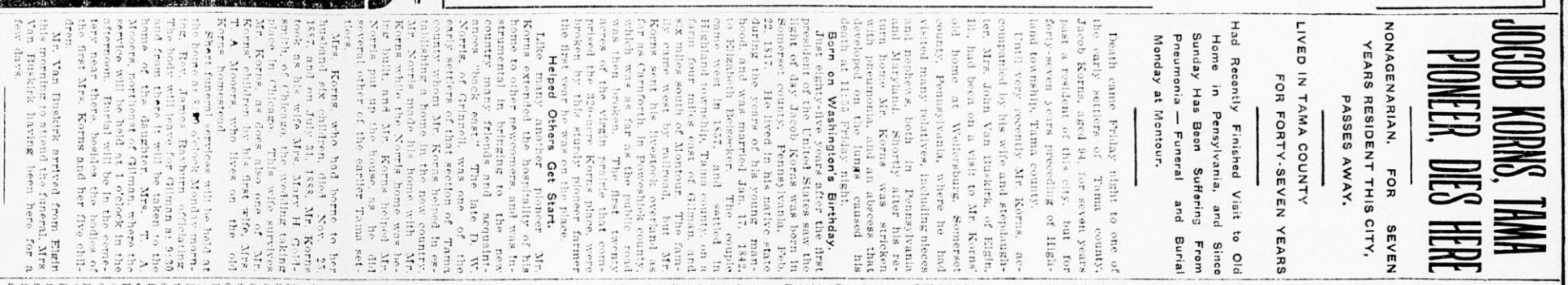 Death came Friday night to one of the early settlers of Tama County, Jacob Korns, aged 94, for seven years past a resident of this city, but for forty-seven years preceding of Highland township, Tama county.