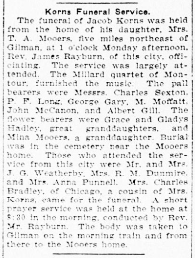 Short funeral services will be held at the home at 8:30 o'clock Monday morning, Rev. James Rayburn officiating. The body will leave for Gilman at 9:30 and from there it will be taken to the home of the daughter, Mrs. T. A. Mooers northeast of Gilman, where the services will be held at 1 o'clock in the afternoon. Burial will be in the cemetery near there, beside the bodies of the first Mrs. Korns and her five children.