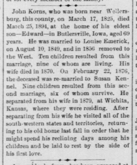 The following obituary was provided by a descendant of the deceased who wishes to remain anonymous. It was published in the Tama Star Clipper, Tama, Iowa, March 1894, page 4. The August 1988 Laurel Messenger states that John was born on March 17, 1825, and died March 25, 1894, and married Louise Emerick on August 10, 1849, and goes on to say that after Louise's death, John married Susan Kennel on February 22, 1876.