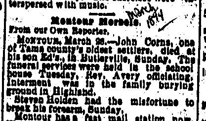 The obituary reads "John Corns, one of Tama county's oldest settlers, died at his son Ed's., in Butlerville, Sunday. The funeral services were held in the school house Tuesday, Rev. Avery officiating. Interment was in the family burying ground in Highland."