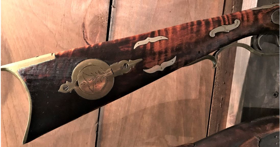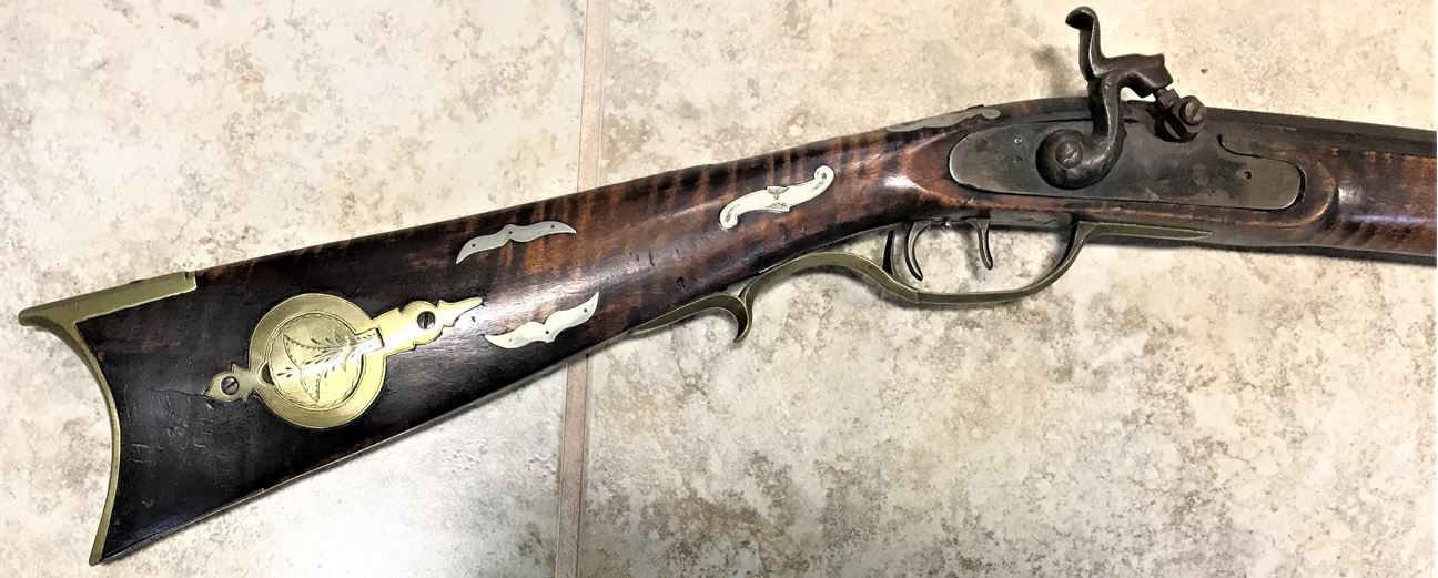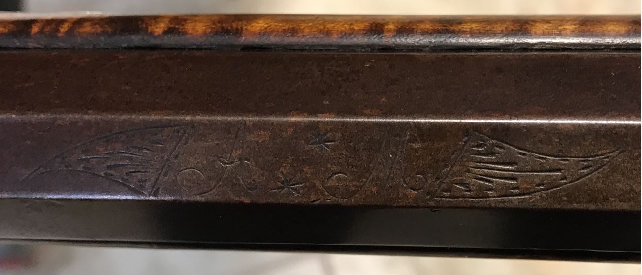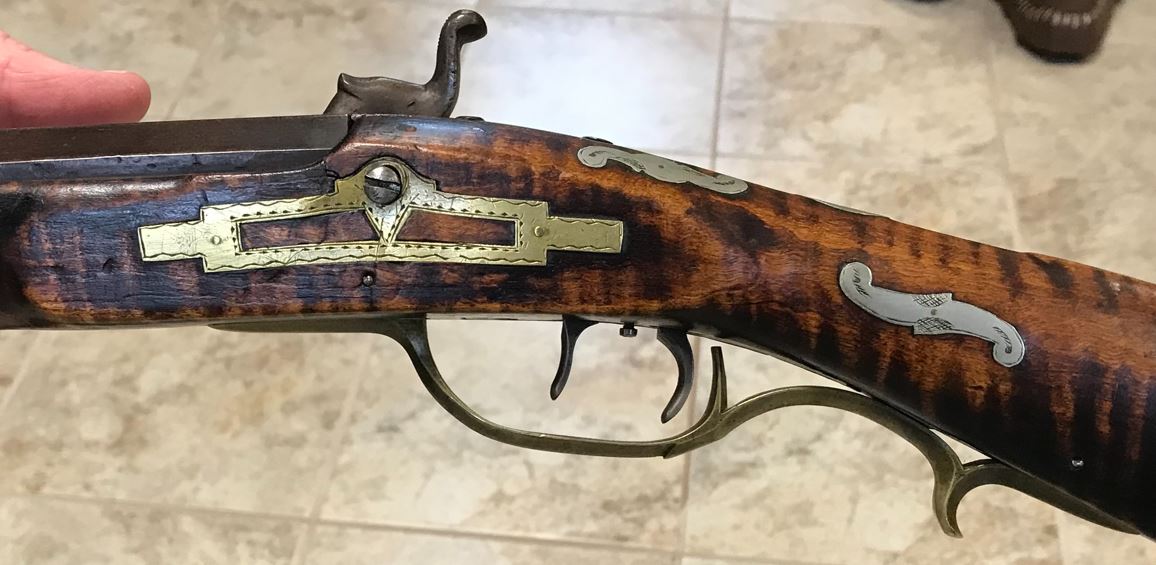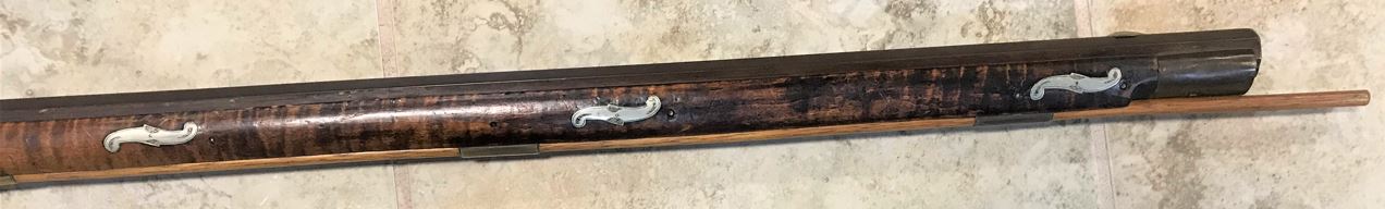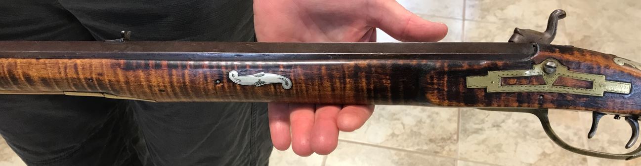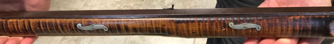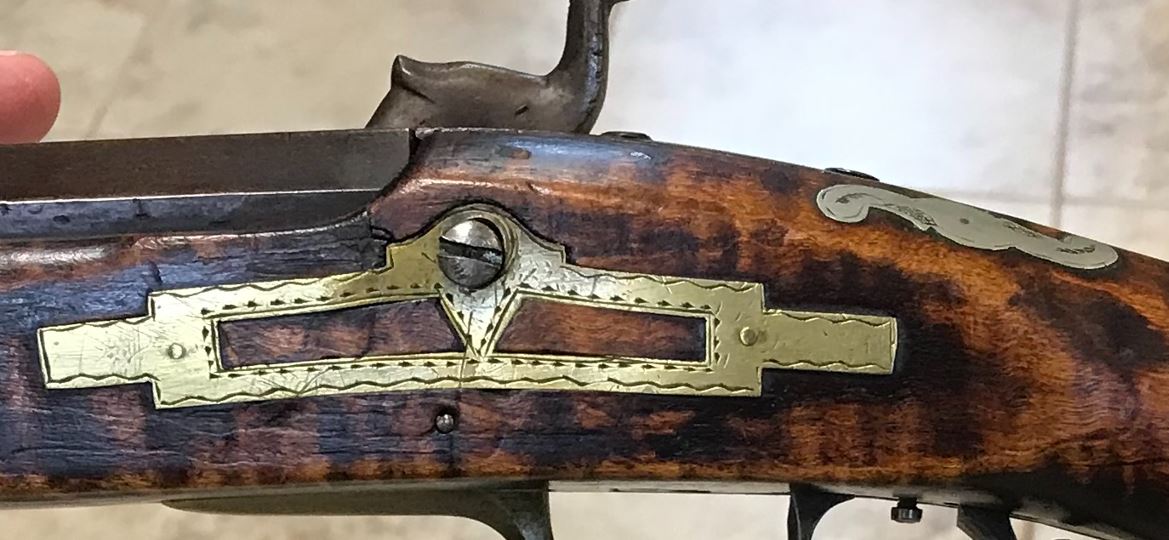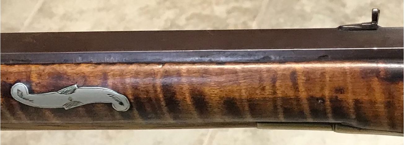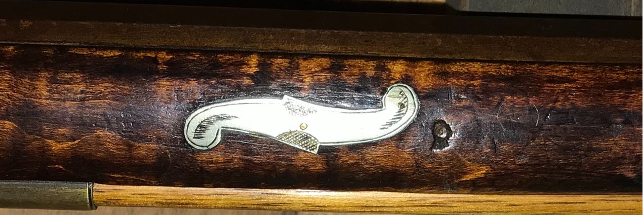 This view shows the rear two engraved silver inlays on the left-hand side of the forearm of this black powder firearm.