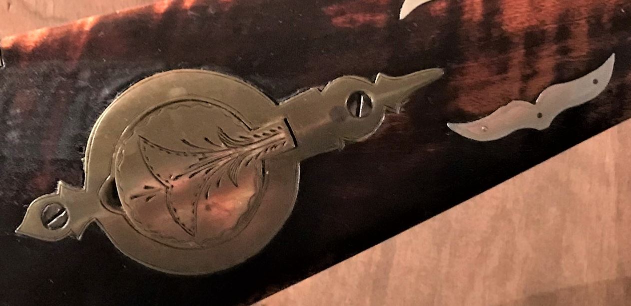 The next photo provides a closeup of the engraved cap box and one of the silver inlays on this elaborately decorated 19th century muzzleloader. The inlay appears to be inspired by a bird in flight.