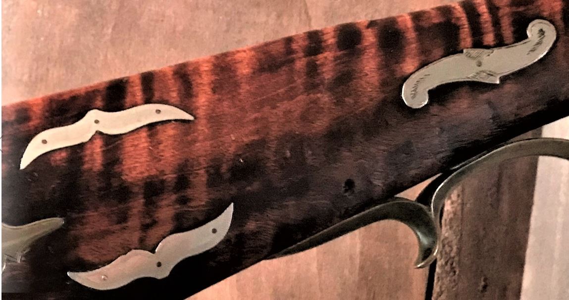 The first image below provides a view of the entire right-hand of the rifle, which has a curly maple full-length stock with a relatively dark finish. This is the only photo I have that shows the presence and length of the toe plate.