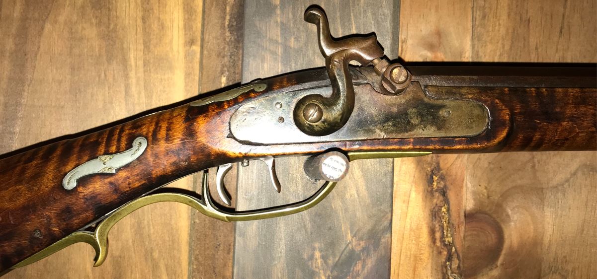The following rifle picture is zoomed out a bit, to show both the buttstock and lock area of the Megahan muzzle loading percussion rifle. The lighting of this picture makes it easier to understand the shape of the stock panel for the lock, compared to the preceding picture.
