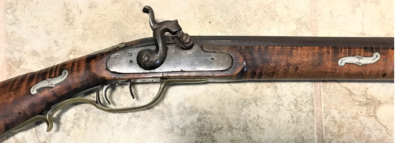 The antique full stock percussion long rifle featured on this page was made and signed by Abraham Megahan, who worked as a gunsmith in Huntingdon and Somerset Counties, Pennsylvania.
