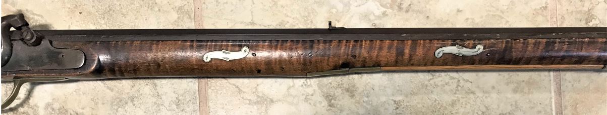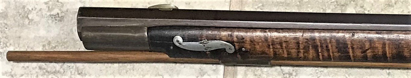 The next photo focuses on a portion of the left-hand side of the rifle from the lock bolt plate to the ramrod entry pipe. This view provides a good look at the curl of the maple stock.