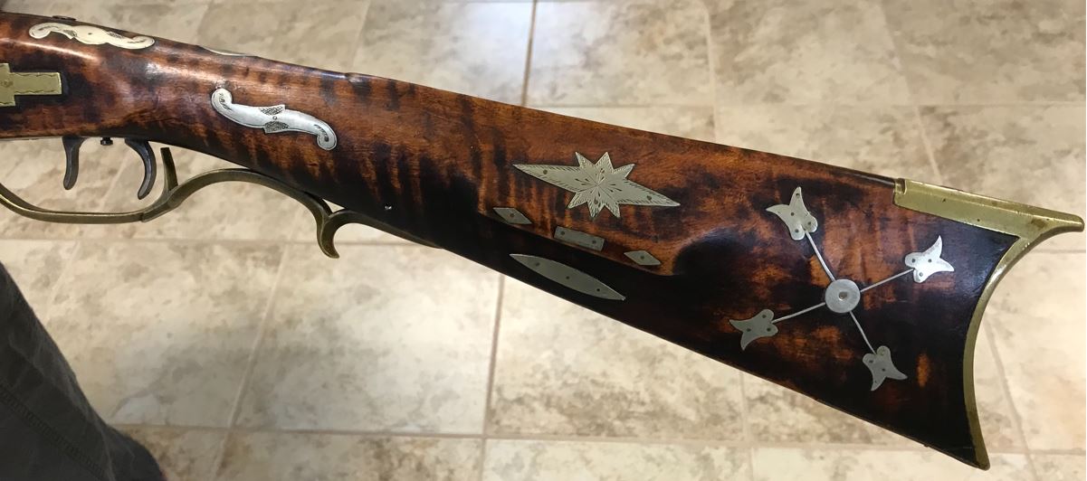 The following picture focuses on the cheekpiece side of the buttstock. The cheekpiece is decorated with an engraved eight-point silver star, two diamond-shaped silver inlays, and a rectangular silver inlay. A lanceolate-shaped inlay is located directly under the cheekpiece. A complex inlay with four radiating tulips is located to the rearward of the cheekpiece. The butt of the rifle is fitted with a cast brass crescent buttplate. A silver engraved wrist inlay is also present.