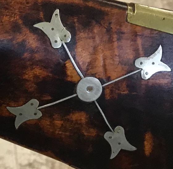 The following picture provides an enlarged view of the three silver inlays on the right-hand side of the buttstock of this antique firearm. The hole for the metal pin that secures the rear of the trigger guard to the gun stock is also visible.
