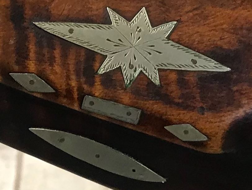 The following photograph provides an enlarged view of one of the decorative silver inlays on the right-hand side of the gun stock.