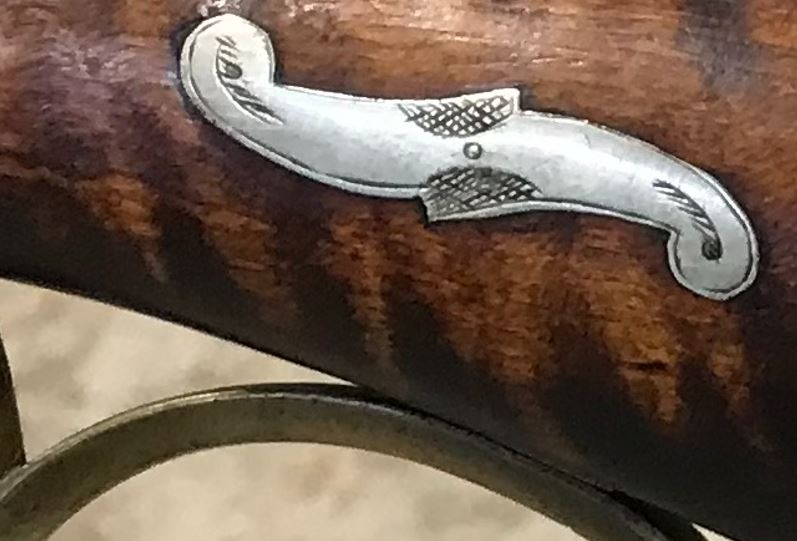 In the following photograph, the camera view has panned to the right to show one of the decorative silver inlays on the fore-end of this ornate Pennsylvania long rifle. One of the cross-pins that secures the full octagon barrel to the stock is visible just forward of the decorative inlay. The surface of the gun lock plate appears to be flush, or nearly so, with the surrounding surface of the stock panel.