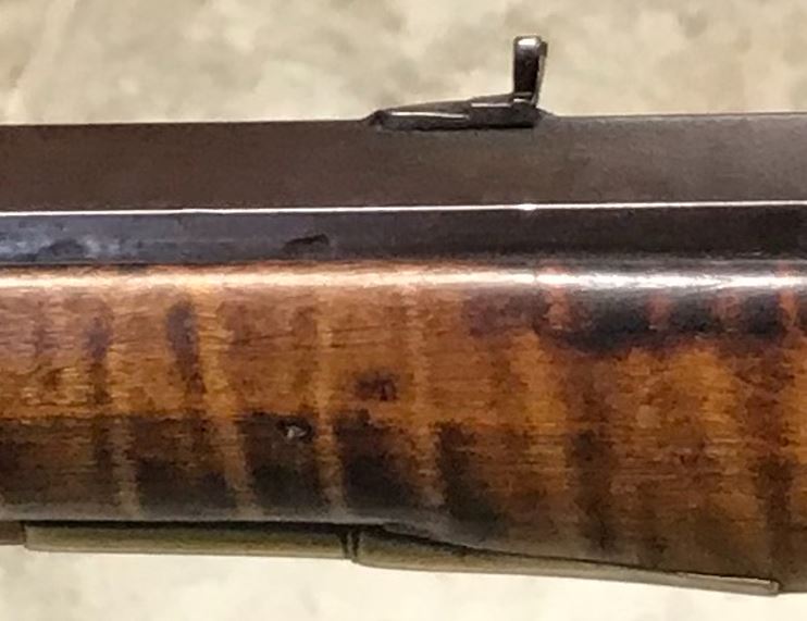 This picture provides a little closer view of the rear sight area of this antique muzzle loading rifle, and shows that the rear sight is dovetailed to the octagonal barrel.