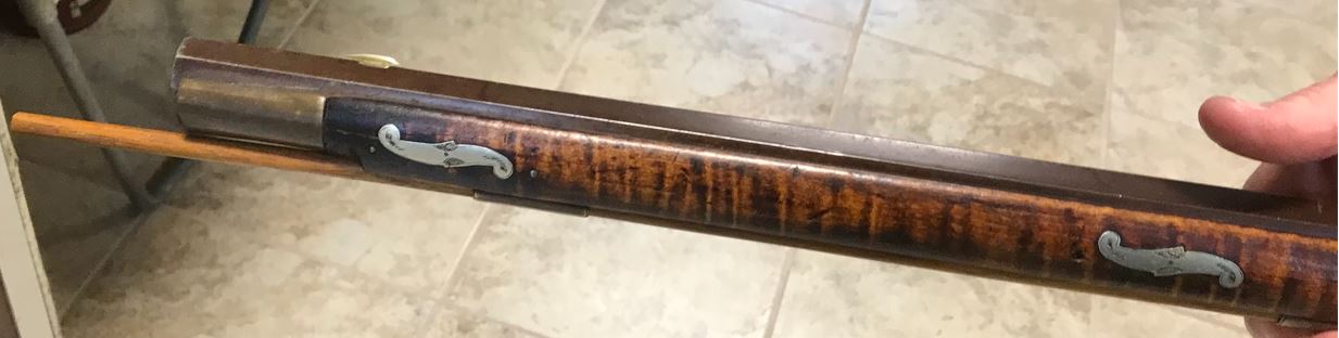 In the next picture, barrel retention pins are present to the right of each of the three silver inlays that are visible. The size of the forestock steps down significantly to match the size of the brass nose cap.