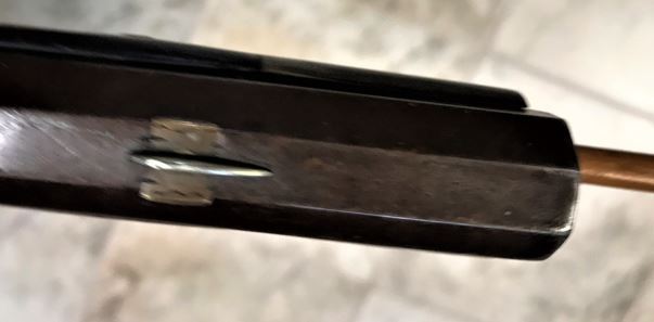 This photo of the barrel inscription uses a little different digital brightness adjustment than the previous one, and provides a glimpse of the fit between the barrel and the barrel channel of the stock.