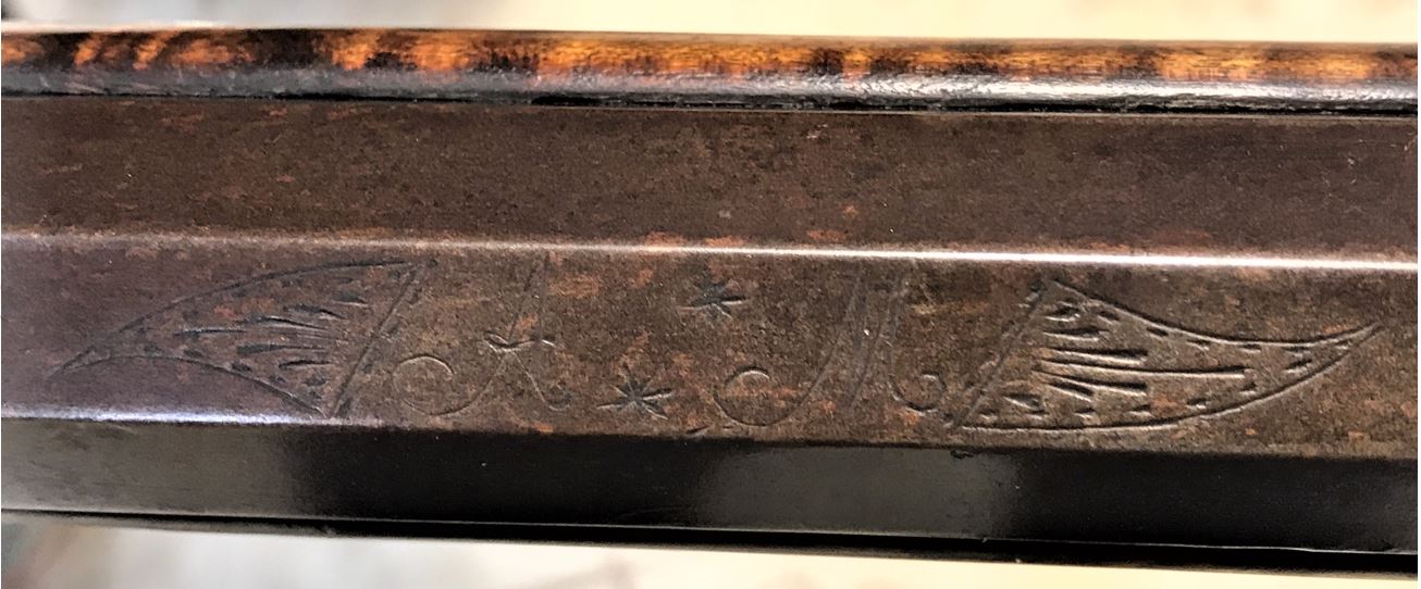The next photo shows the engraved cursive initials "A M" on the upper flat of the barrel. The initials are separated by two astericks and flanked by engraved wing-like decorations.