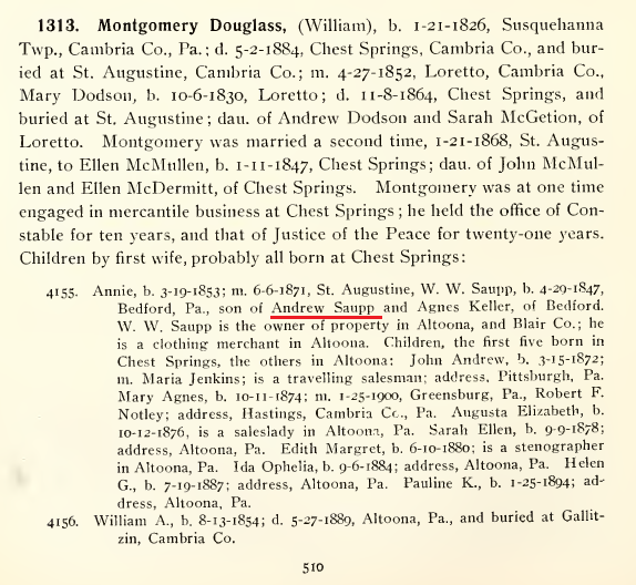1871: As indicated above, the 1911 book "Genealogy of the Hannum Family..." reports that W. W. Saupp, son of Andrew and Agnes Saupp, married Annie Douglas on June 6, 1871.