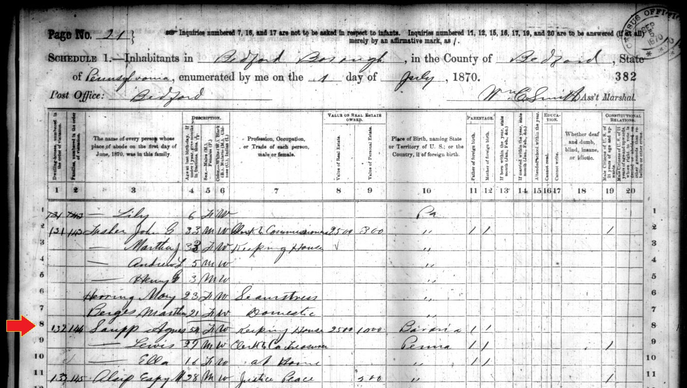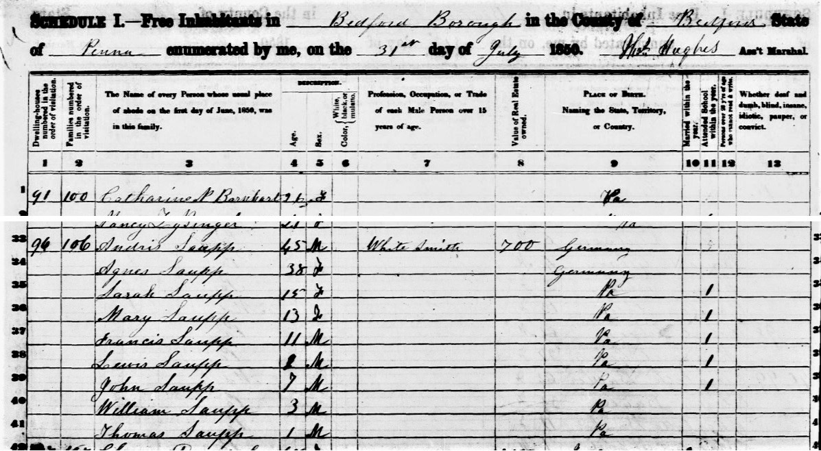 1850: In the Bedford borough portion of the 1850 census records of Bedford County, Pennsylvania, Andris Saupp is enumerated s a 45-year old German-born White Smith with property valued at $700.00 who was living with 38-year-old German-born Agnes Saupp. Also living in the household were 15-year-old Sarah Saupp, 13-year-old Mary Saupp, 11-year-old Francis Saupp, 9-year-old Lewis Saupp, 7-year-old John Saupp, 3-year-old William Saupp and 1-year-old Thomas Saupp, all Pennsylvania-born. The census record was made on July 31, 1850.