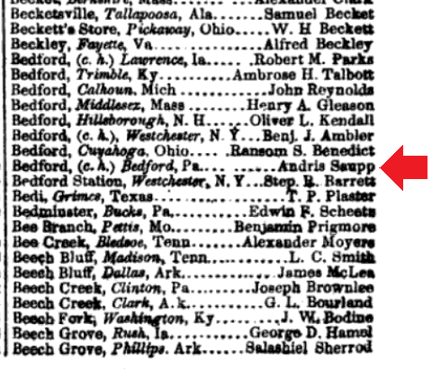 1855: The obituary of Andris Saupp appears in the September 21, 1855 issue of the "Bedford Gazette" newspaper.