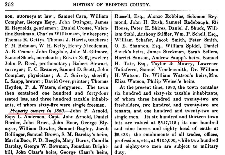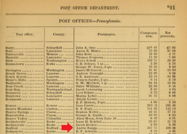 1860: According to the list of 1860 property owners in the town of Bedford that is included in the 1884 book "History of Bedford, Somerset and Fulton Counties, Pennsylvania", Andrew Saupp was deceased by 1860: