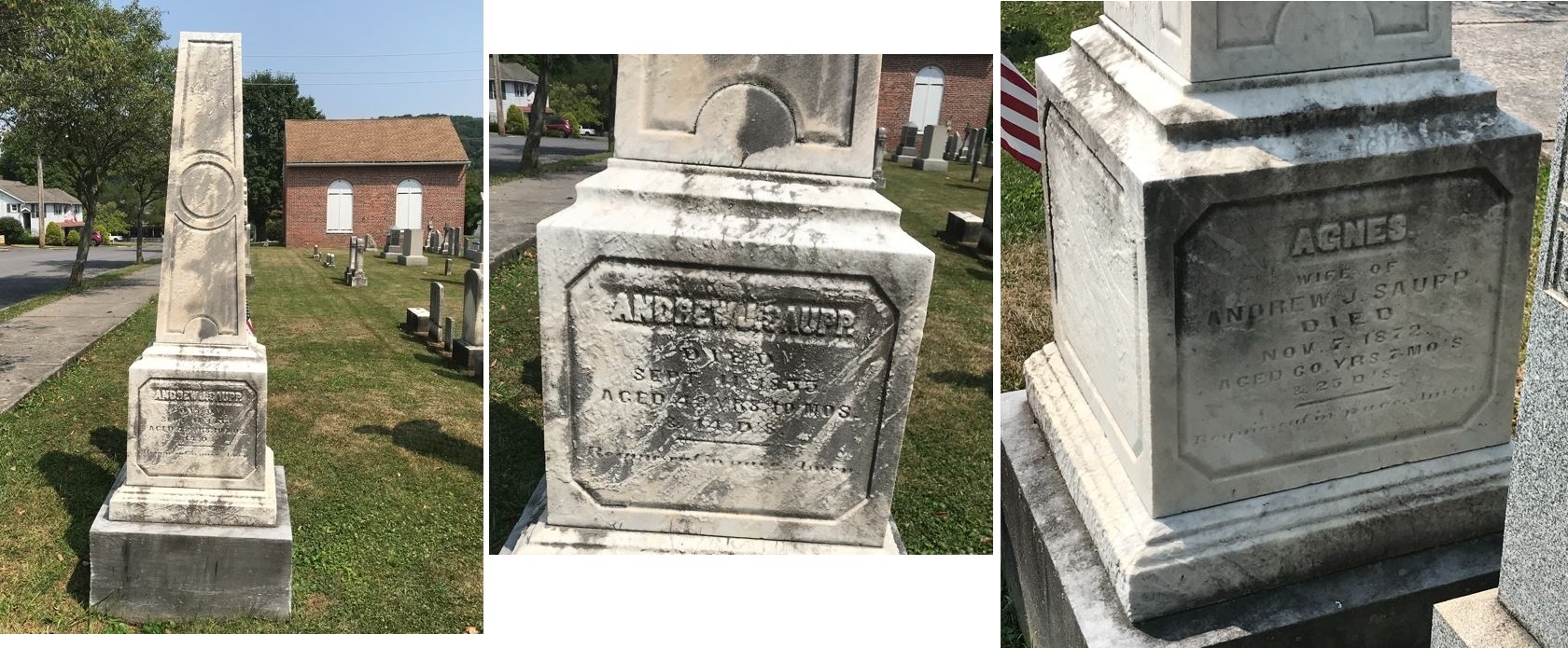 1810: According to the information on her tombstone, Agnes, wife of Andrew Saupp, was born in 1810.