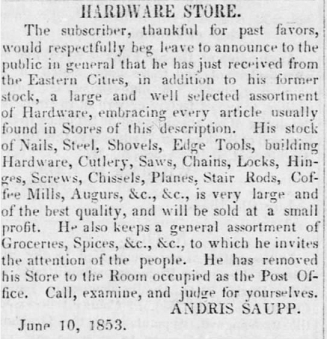 1854: The 1983 booklet reports that Andris Saupp was the Bedford Postmaster in 1854. The following excerpt is from the October 12, 1854 issue of the "Texas Ranger" newspaper (An identical or similar article was published in the September 23, 1854 issue of the "Fort Wayne Sentinel" newspaper):