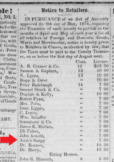 The 2001 Whisker & Yantz book reports that Andrew Saupp appears in the tax rolls with various occupations, including merchant, postmaster, whitesmith, and gunsmith.