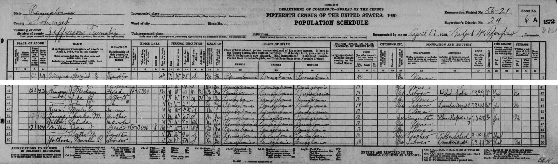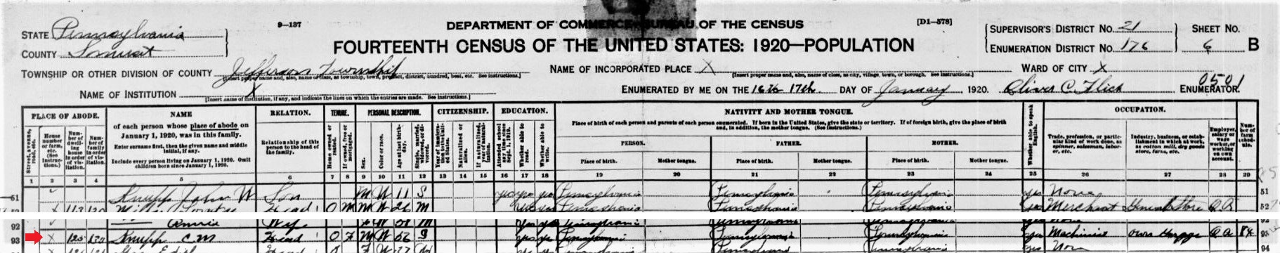 1910: The following excerpt is from the Jefferson Township portion of the manuscript 1910 census records of Somerset County, Pennsylvania: