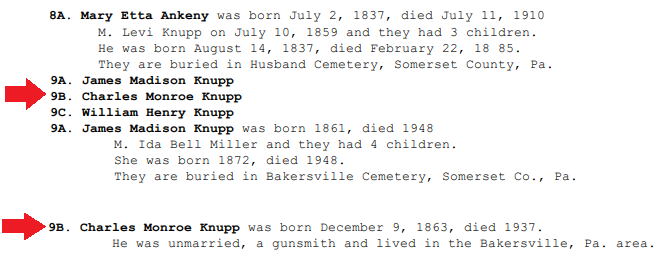 1937: The 2017 book "Gunsmiths of Somerset County, Pennsylvania" reports that Charles Monroe Knupp willed most of his possessions to his brother and his sister-in-law Mr. & Mrs. James Madison Knupp because they took care of him in his old age.