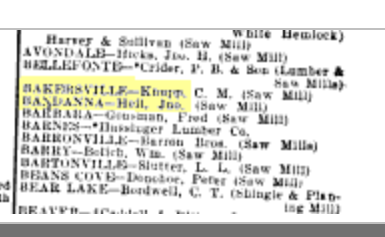 1906: The 1906 edition of "Hendrick's Commercial Register of the United States for Buyers and Sellers" lists C. M. Knupp in Bakersville (Somerset County) with a sawmill. Bakersville is located in Jefferson Township at 40.03935483, -79.2152649, and on modern roads is about 13.5 miles west of where Jonathan Dormayer lived.