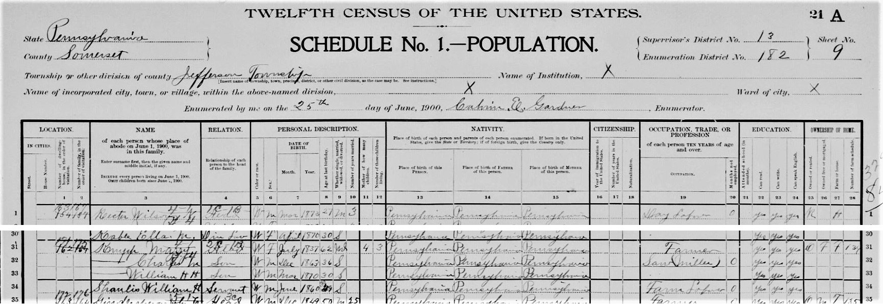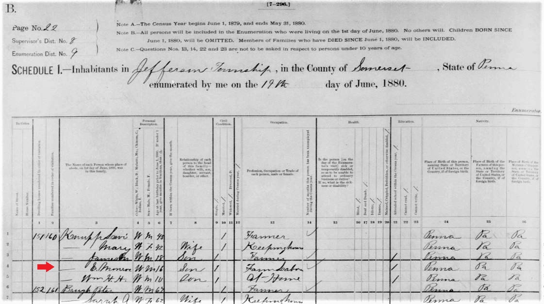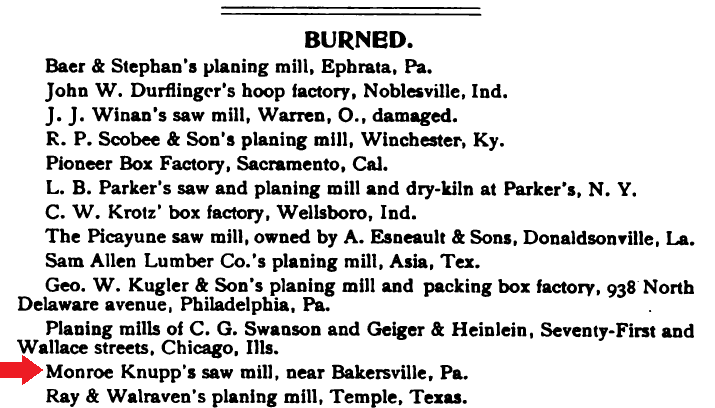 1900: The 1900 census of Somerset County indicates that Charles Monroe Knupp was operating a sawmill and living with his mother Mary, his brother William, and a servant named William Shaulis.