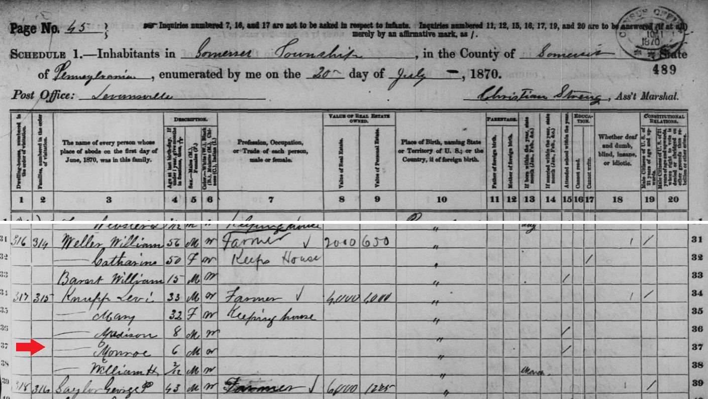 1870: On July 20, 1870 Levi Knupp was enumerated in the federal census of Somerset Township as a 33-year-old Pennsylvania-born farmer with real estate valued at $4,000.00 and personal property valued at $1,000. his household was 32-year-old Mary keeping house, 8-year-old Madison Knupp, 6-year-old Monroe Knupp, and less than one-year-old William H. Knupp, all Pennsylvania born.