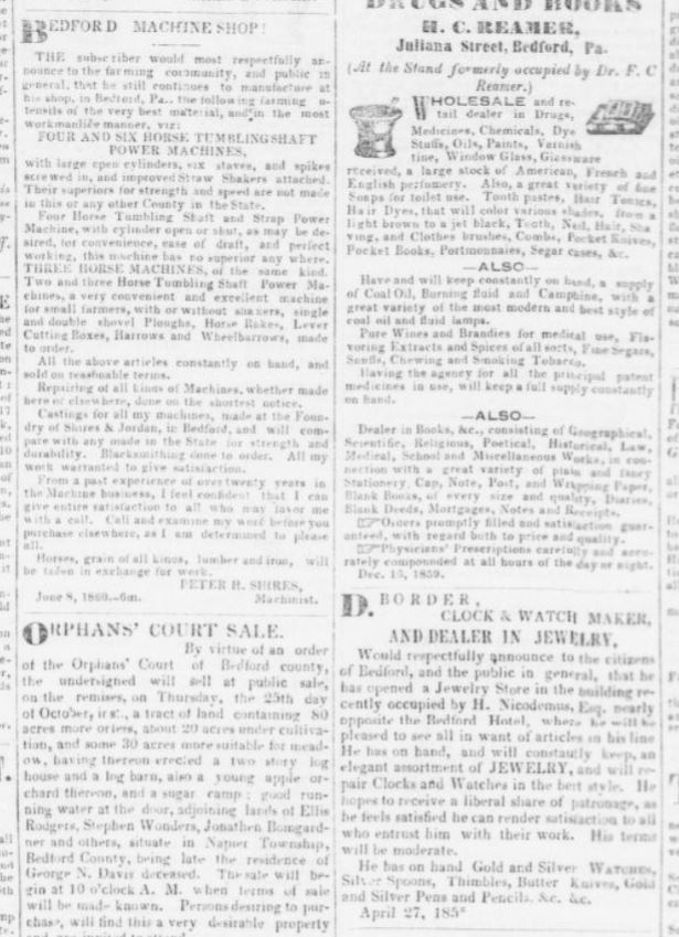 1851: The 2001 book "Gunsmiths of Bedford, Fulton, Huntington, & Somerset Counties" indicates that gunsmith Daniel Border manufactured 200 apple peelers for William Hartley in 1851 and made a scale model of a mowing machine for William Hartley as a sales model. I suspect that to accomplish these tasks, Daniel Border (then about 25 years old) either had access to machine shop equipment or employed the services of a machine shop. The apple peelers may have also required the services of a foundry.