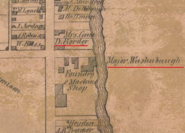 1854: An 1854 newspaper advertisement indicates that Daniel Border moved his gun shop one door down from Washabaugh's residence in the east end of town. Washabaugh lived on the lot where the machine shop and foundry were located. I suspect that a desire for handy access to machine shop equipment, or the use of the services of the machine shop, influenced Daniel Border's decision to move his shop to be right across the street from Washabaugh's machine shop and foundry.