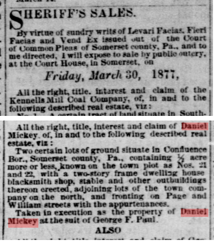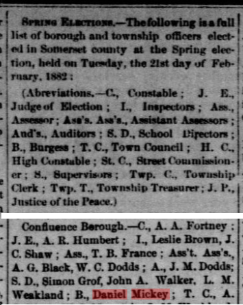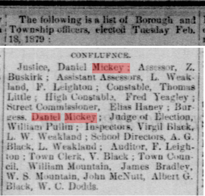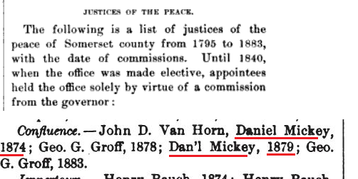 1874 & 1879: The following item from the 1884 book "History of Bedford, Somerset, and Fulton Counties, Pennsylvania" indicates that Daniel Mickey was a Justice of the Peace in Confluence in 1874 and 1879.