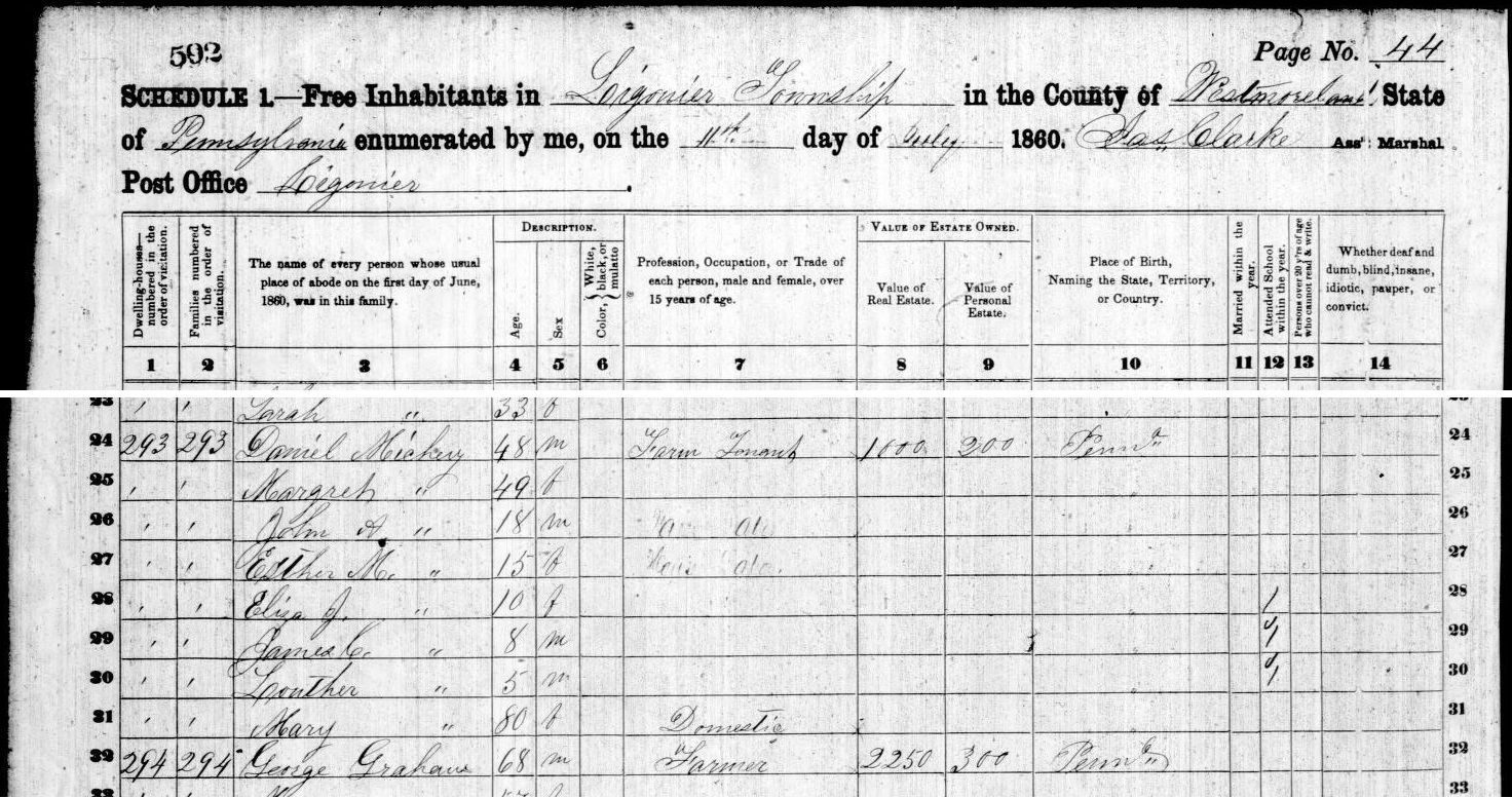 1860: In the 1860 census of Ligonier Township, Westmoreland County, Daniel Mickey is 48 years old. In his household are 49-year-old Margaret, 18-year-old John A., 15-year-old Esther M., 10-year-old Eliza J., 8-year-old James C., 5-year-old Louther, and 80-year-old Mary.