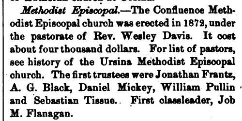 1872: The following item from the 1884 book "History of Bedford, Somerset, and Fulton Counties, Pennsylvania" indicates that Daniel Mickey was one of the first Trustees of the Confluence Methodist Episcopal Church: