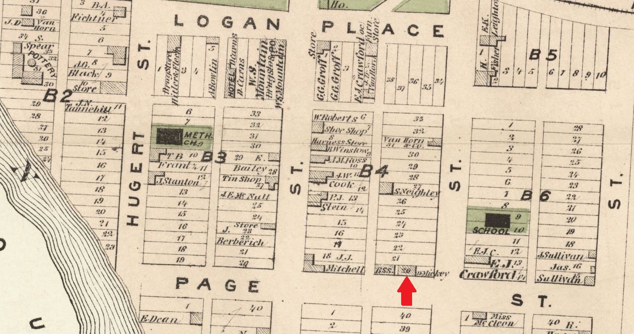 1876: The following excerpt from the Confluence portion of the 1876 "County Atlas of Somerset, Pennsylvania" shows a "D. Mickey" with a blacksmith shop on lot 20, near the intersection of Page and William streets. The blacksmith shop would have been located approximately at 39.810611, -79.357110.