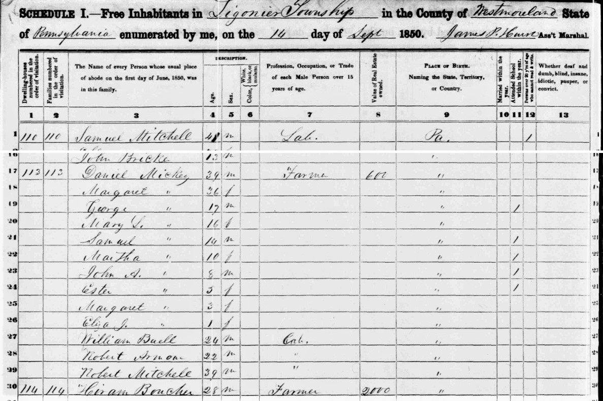 1840: In a transcript prepared from the 1840 census records of Ligonier Township, Westmoreland County, Pennsylvania a Daniel Mickey household has one male and one female in the 20-30 age group, one female in the 10-15 age group, one female in the 5-10 age group, and one male and one female under age five. I have not been able to locate a copy of the manuscript 1810 census records of Ligonier Township.