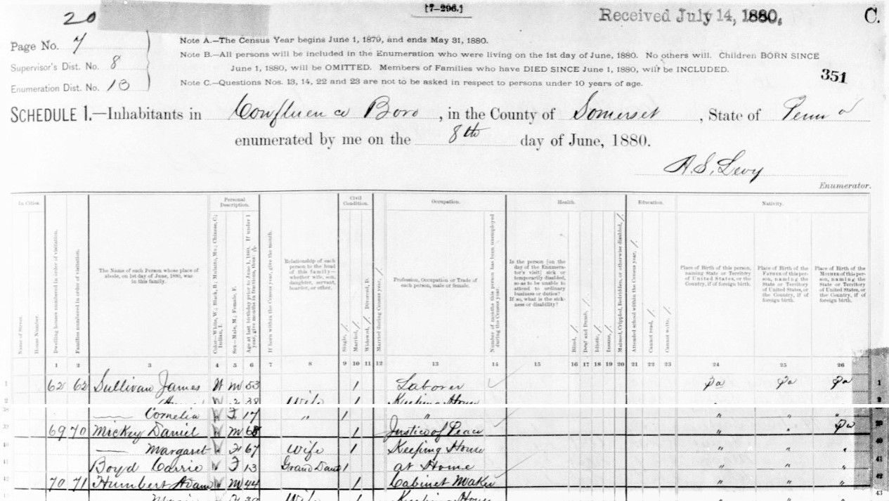 1880: The following excerpt is from the 1880 census of the borough of Confluence in Somerset County, Pennsylvania: