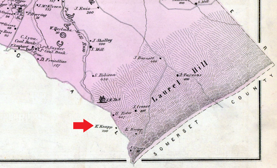 1876: The following image is from the Cook Township portion of the 1876 "Illustrated Atlas of Westmoreland Co. Pennsylvania". It locates the residence of E. Knupp in Donegal Township, just south of the border between Donegal and Cook townships. Elias's residence was at or near the source of Indian Creek, and roughly 1.4 miles south of the source of Powder Mill Run. In 1869, the road along Powder Mill Run was known as the "Old Powder Mill road". A fragment of the road is still in use, and is still called Powder Mill Road.