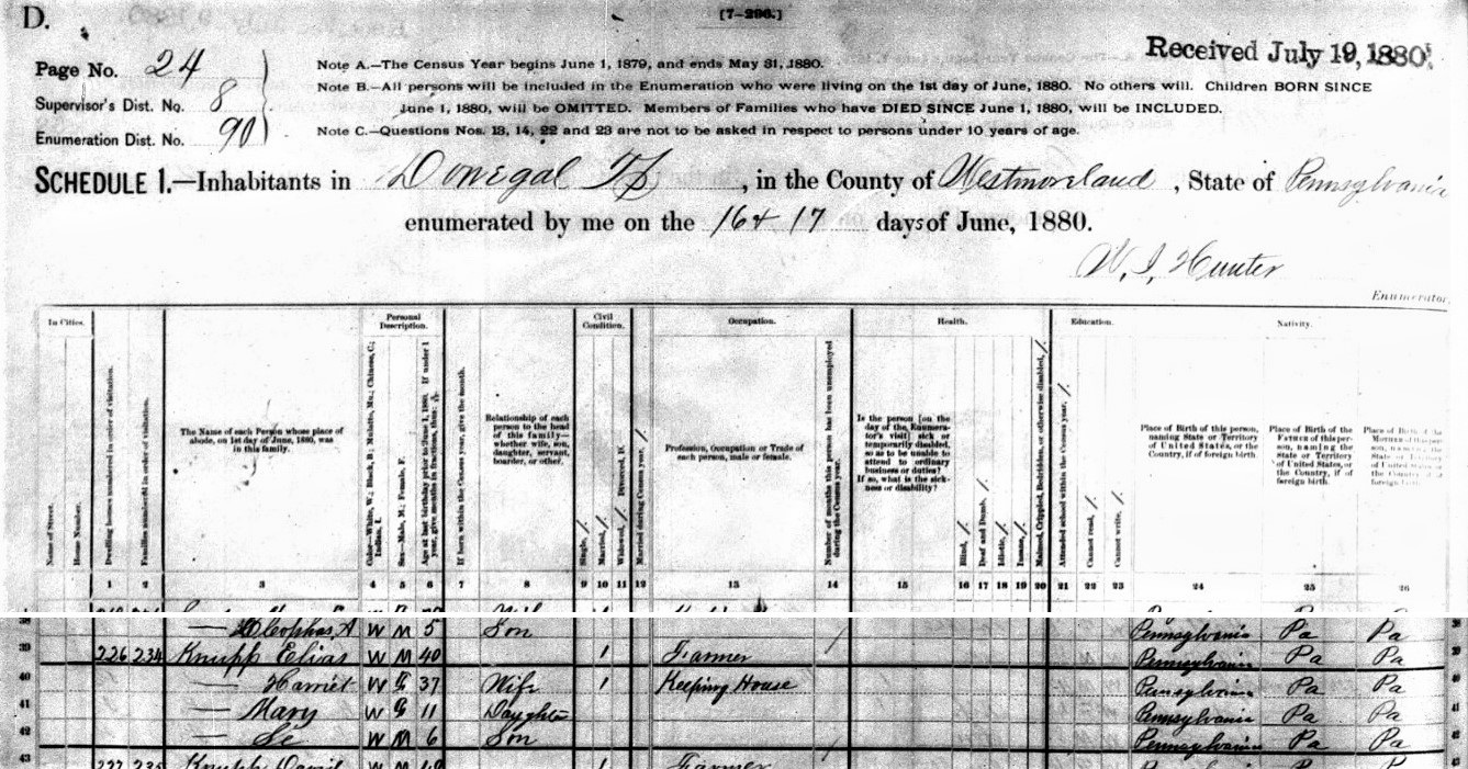 1880: According to the 2017 book "Gunsmiths of Somerset County, Pennsylvania", in the 1880 census of Donegal Township, Westmoreland County, Elias Knupp was enumerated as a gunsmith. As you can see below, that is incorrect. In the 1880 census, Elias Knupp is enumerated as a farmer.