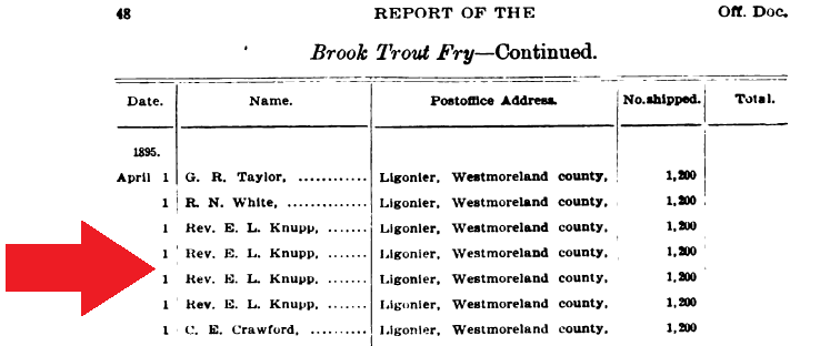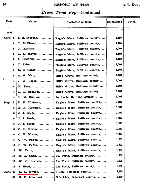 1893: The following item is from the 1895 book "Report of the State Commissioners of fisheries, for the years 1892-93-94". It indicates that 2,400 brook trout fry were shipped to Elias Knupp of Somerset County.