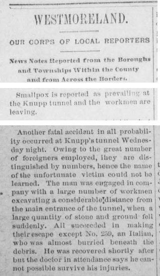 1884: This news item from the July 9, 1884 issue of the "Somerset Herald" newspaper mentions Knupp's tunnel.