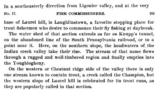 1895: The following item is from the 1896 book "Report of the State Commissioners of fisheries, for the year 1895", and shows that Elias Knupp was then served by the Ligonier post office. Ligonier is 9.6 miles north of the western mouth of the abandoned Laurel Hill Tunnel.