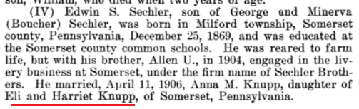 1906: This excerpt from Volume III of the 1906 book "History of Bedford and Somerset Counties Pennsylvania" indicates that Anna M. Knupp, daughter of Eli and Harriet Knupp, was married to Edwin S. Sechler in 1906, and refers to Eli and Harriet Knupp as residents of Somerset, Pennsylvania.