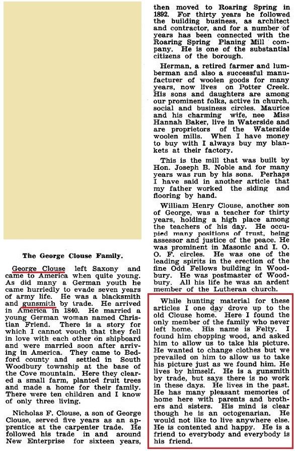 Circa 1933: The following article by the Reverend C.W. Karns was originally printed in the "Altoona Mirror" newspaper, and describes a visit with Felty Clouse. In 1933 it was published as part of a compilation titled "Historical Sketches of Morrisons Cove":