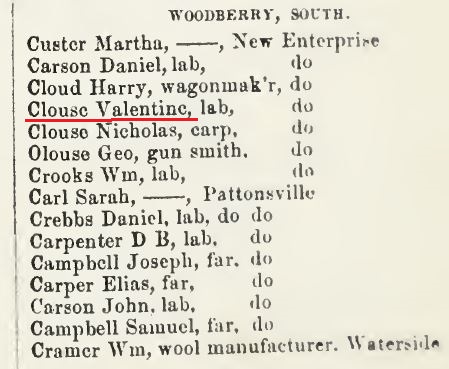 1900: The following entry is from the 1900 directory of Bedford County. It identifies Valentine Clouse as a farmer with a Brumbaugh address: