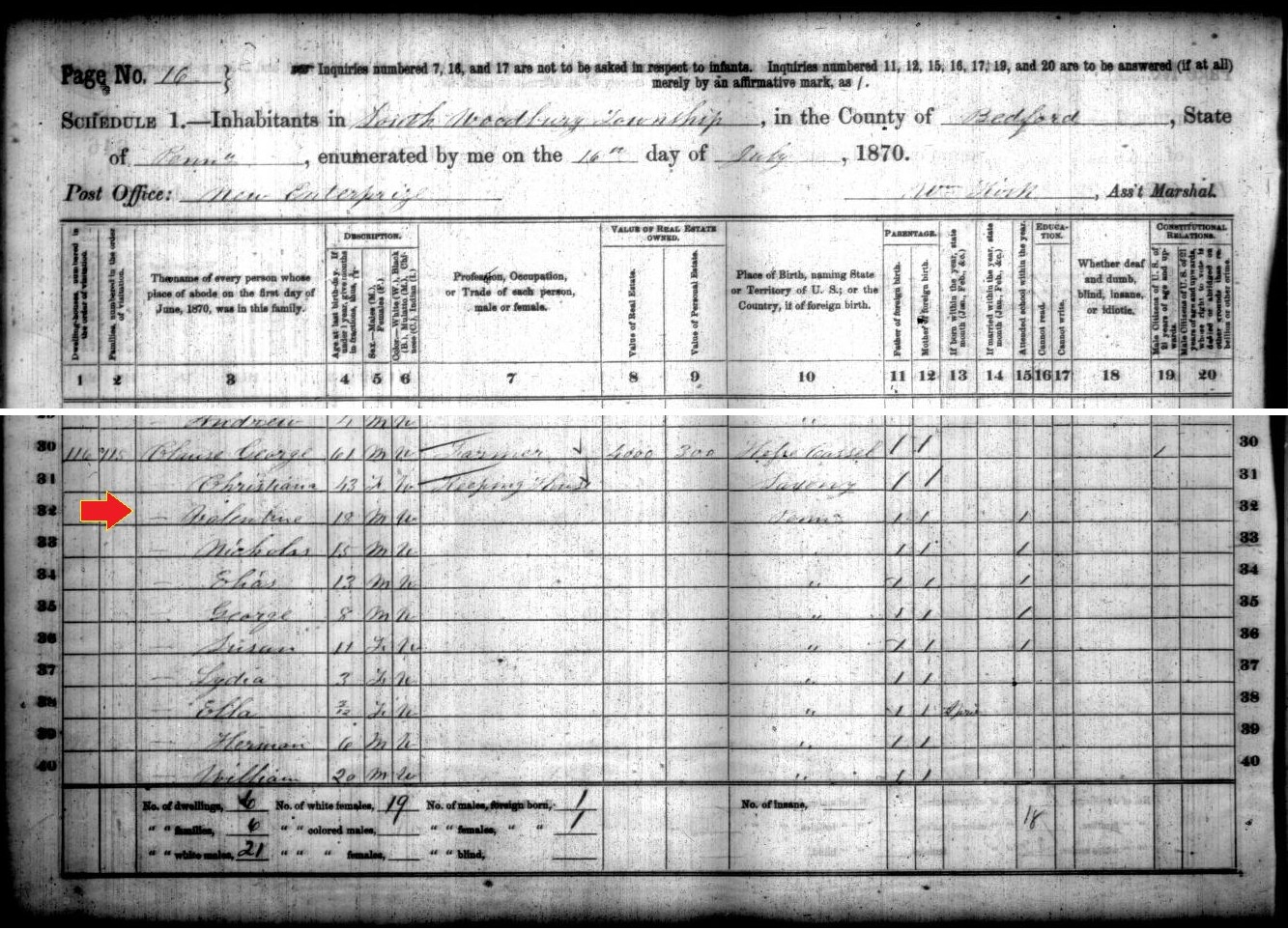 1870: In the 1870 census records of South Woodbury Township, Valentine Clouse is listed as an 18-year-old living in his father's household: